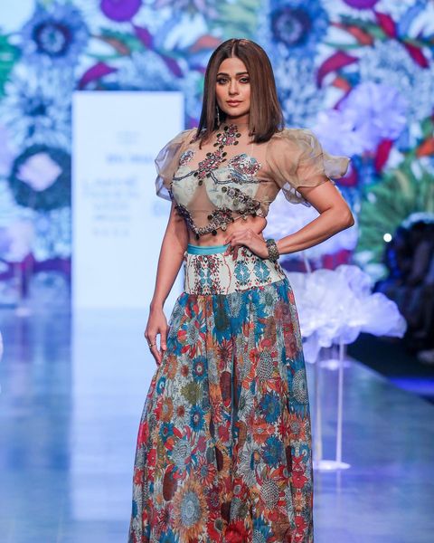 Shamita Shetty: She walked for designer Rina Dhaka in her printed outfit featuring a paneled crop top and high-slit shirt. She looked stunning with a round neck top and puffed half sleeves. And with all eyes falling on her as she walked in full feminine grace.