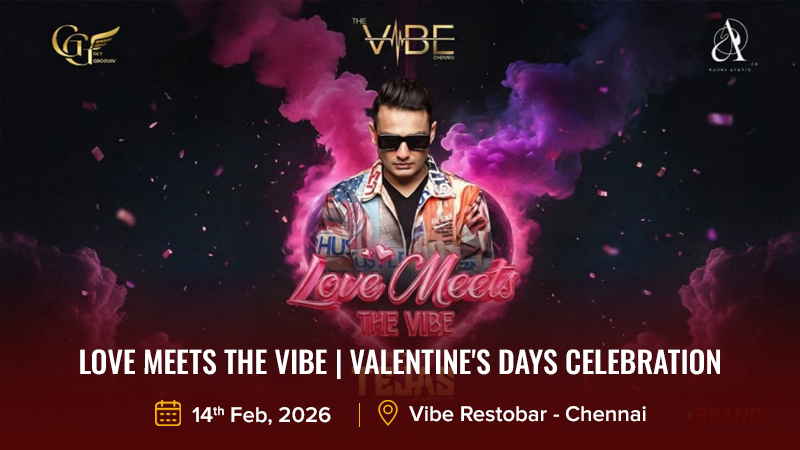 Feel the love and the beats this Valentine’s Day as DJ Tejas lights up Vibe Restobar, Chennai, bringing you an evening packed with energy, romance, and irresistible vibes. Step into an electrifying night where high-energy beats meet soulful favourites, vibrant lights set the mood, and the dance floor stays alive all night long. From heart-thumping anthems to feel-good tracks, DJ Tejas promises nonstop mixes perfect for couples and party-goers alike. Bring your special someone or your whole gang and get ready to create unforgettable Valentine’s memories.