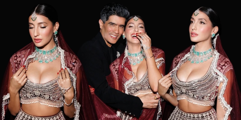 Nora Fatehi made a grand entrance in an opulent deep garnet velvet lehenga from Manish Malhotra’s “INAYA” Bridal Collection 2025-26. The stunning attire, which took 1,400 hours to complete, featured heavy floral zardozi work and shimmering cut dana and beads, accessorized with a glowing emerald-diamond jewellery set.