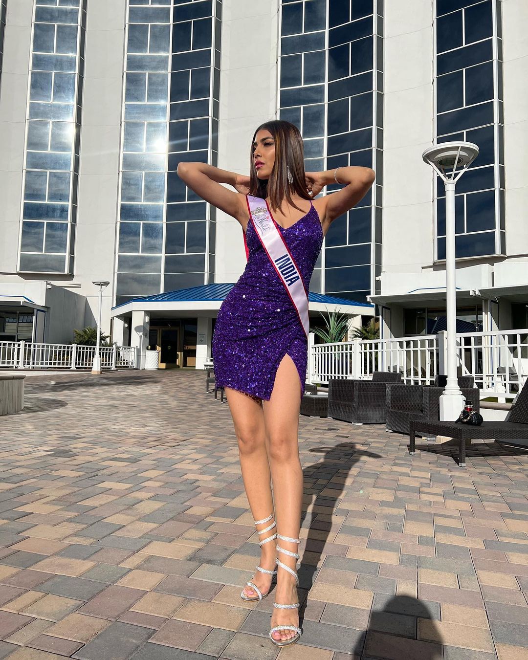 For the final round, she wore a pink center-slit glitter sequin gown by Bhavana Rao. She was mentored for the runway by pageant expert and model Alessia Raut.