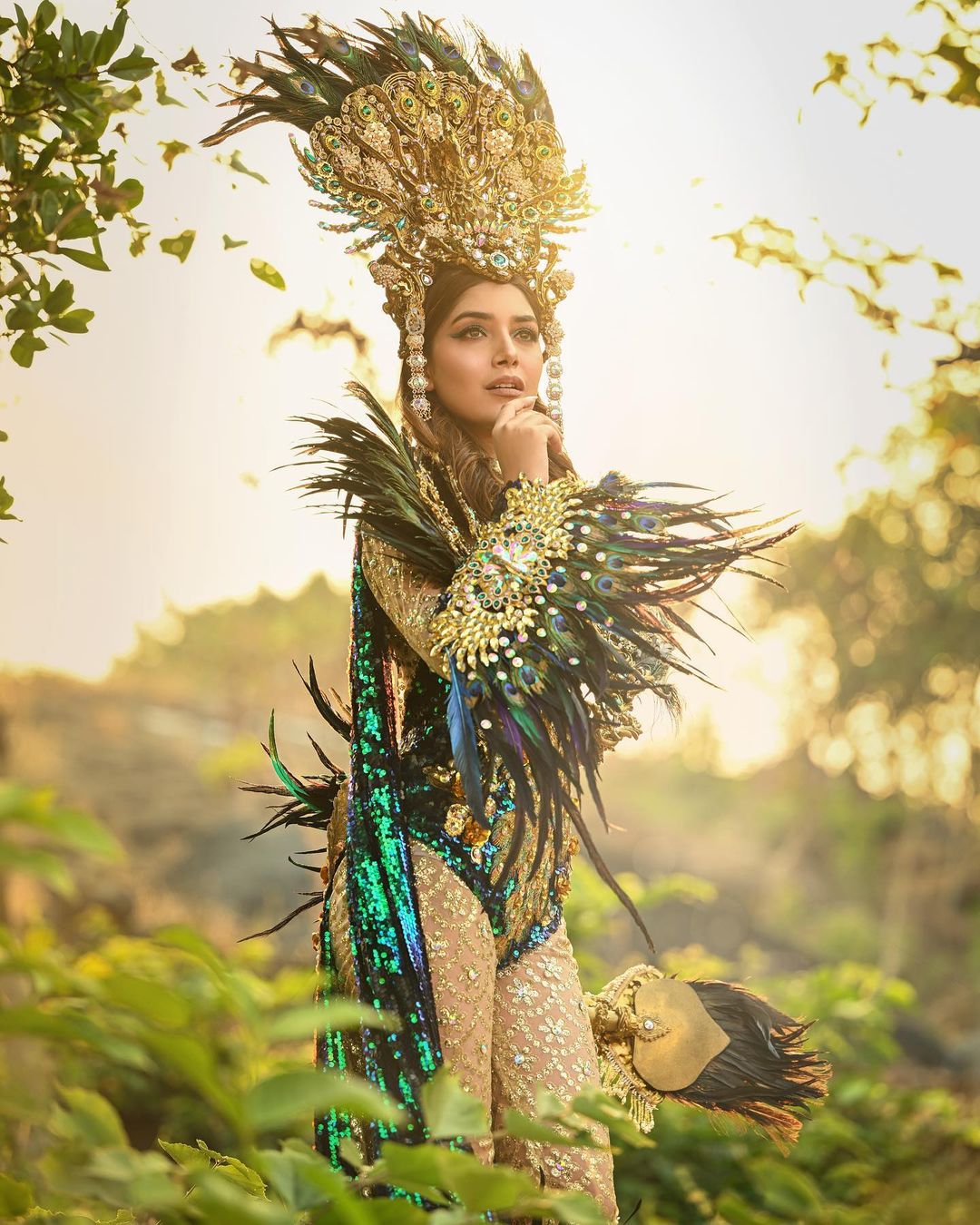 Her national costume is perfused with peacock feathers and motifs, which is a Kashmiri phiran handcrafted by indigenous women from villages of Kashmir.