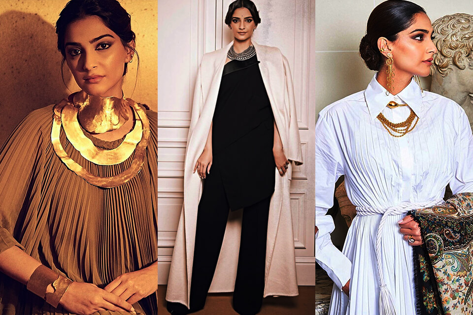 Sonam’s latest outfits were brown colored, white-colored, and black & white colored. However, the hues were not by any means the only significant aspects here, the more important point was the balance. For example, talking about her flowy brown-toned, and striped ensemble by Elie Saab, it was complemented by that statement gold-toned neckpiece. It was a downplayed and wispy number however that substantial Pipa. Bella and Rhea Kapoor’s teamed up neckpiece completely added some zest to her look.